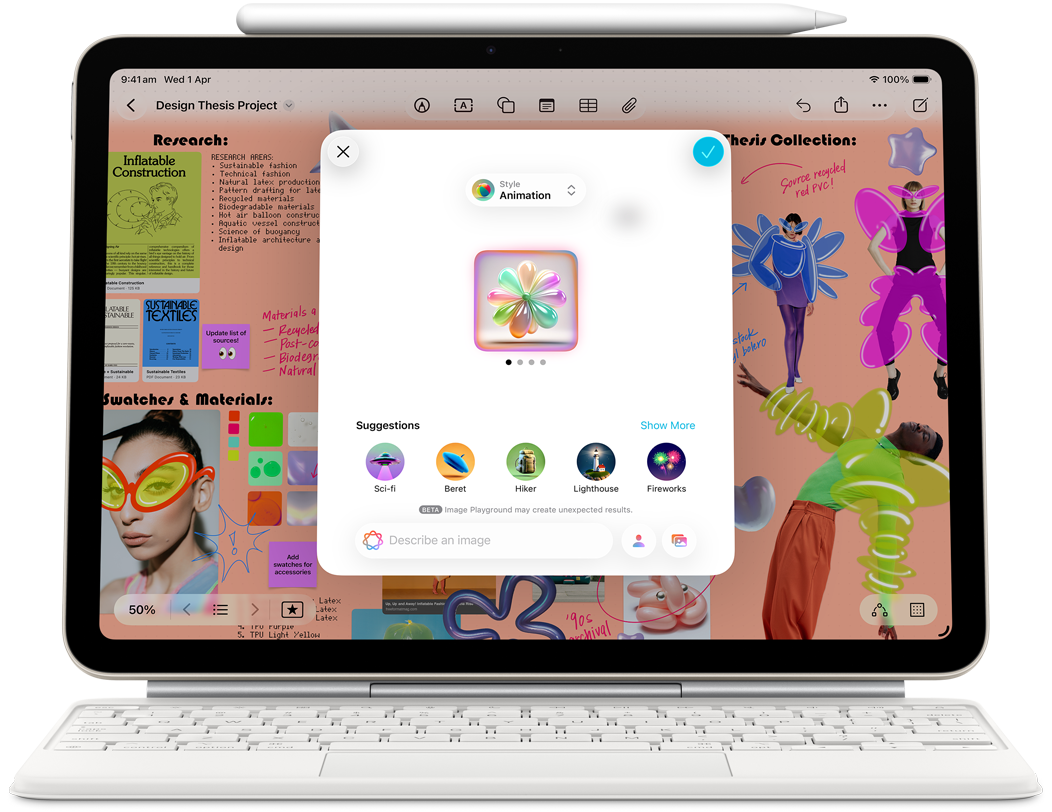Landscape view of iPad Air showcasing Apple Intelligence with Image Wand in Notes, Apple Pencil Pro
