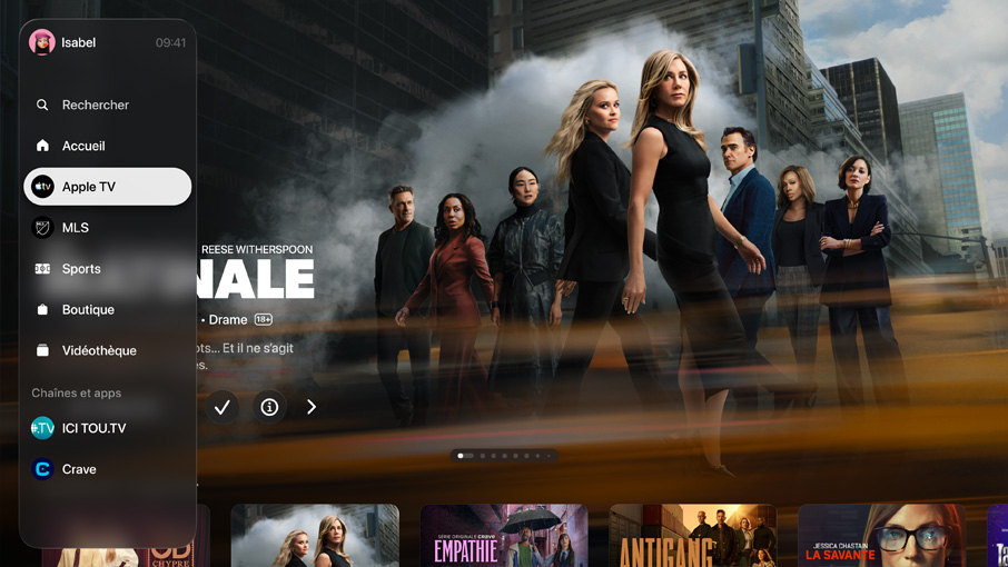 Plongez-vous dans les films et séries Apple Original primés, sans oublier les succès de Disney+, Netflix, Prime Video, Crave, ICI TOU.TV et bien d’autres3. Entraînez-vous comme les pros, découvrez des jeux enlevants, écoutez la musique de l’heure proposée en exclusivité par Apple et dénichez des milliers d’apps géniales sur l’App Store. Apple TV 4K, c’est beaucoup plus que de la télé.
