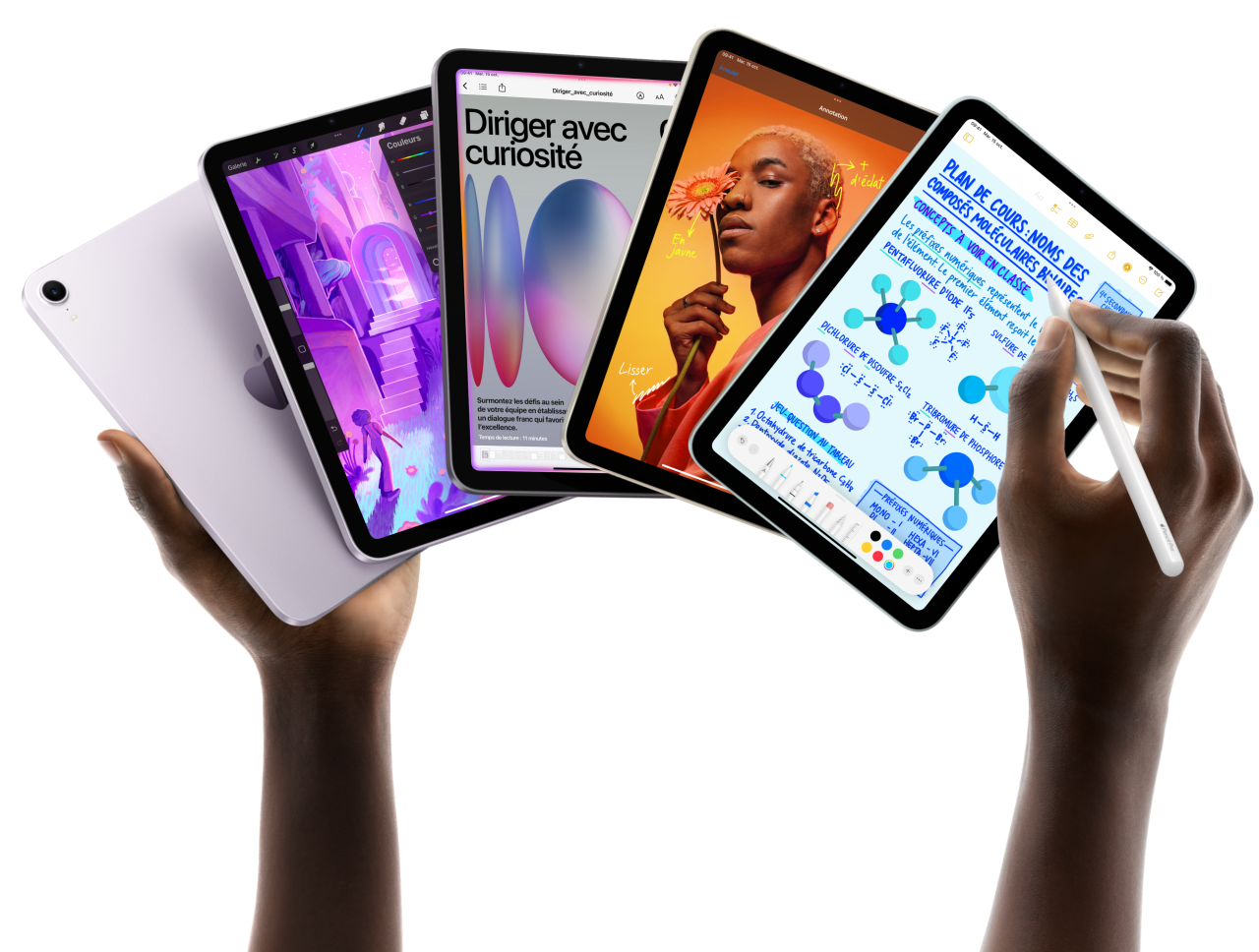 Une main tenant cinq iPad mini disposés en éventail. L’un d’eux montre la caméra arrière, et les quatre autres sont vus de face. Un Apple Pencil Pro servant à prendre des notes.