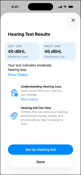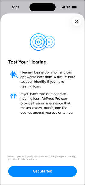 Tout est privé, sécurisé et facile à gérer. Les données de votre Test d’audition restent privées et sont stockées en toute sécurité dans l’app Santé de votre appareil. À tout moment, vous pouvez repasser le test, en télécharger les résultats, surveiller votre audition et lire des articles sur la santé auditive.