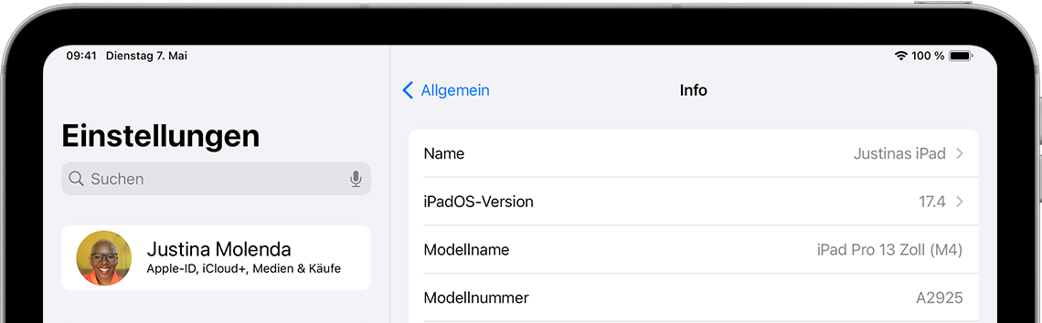 Wenn du iPadOS oder iOS 12.2 oder neuer verwendest, gehe zu „Einstellungen“ > „Allgemein“ > „Info“ > „Modellname“.