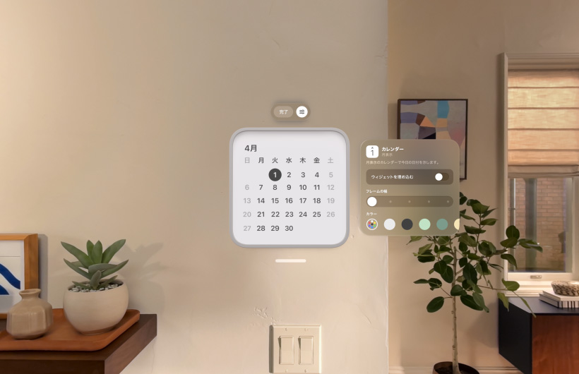 ウィジェットを使うと、写真、時計、ミュージック、カレンダーなど、お気に入りの情報やアプリをあなたの空間に思いどおりに配置できます。フレームの厚み、色、奥行きをカスタマイズするのも簡単。Apple Vision Proを装着するたびに、あなたが前回アレンジしたとおりの空間が広がります。