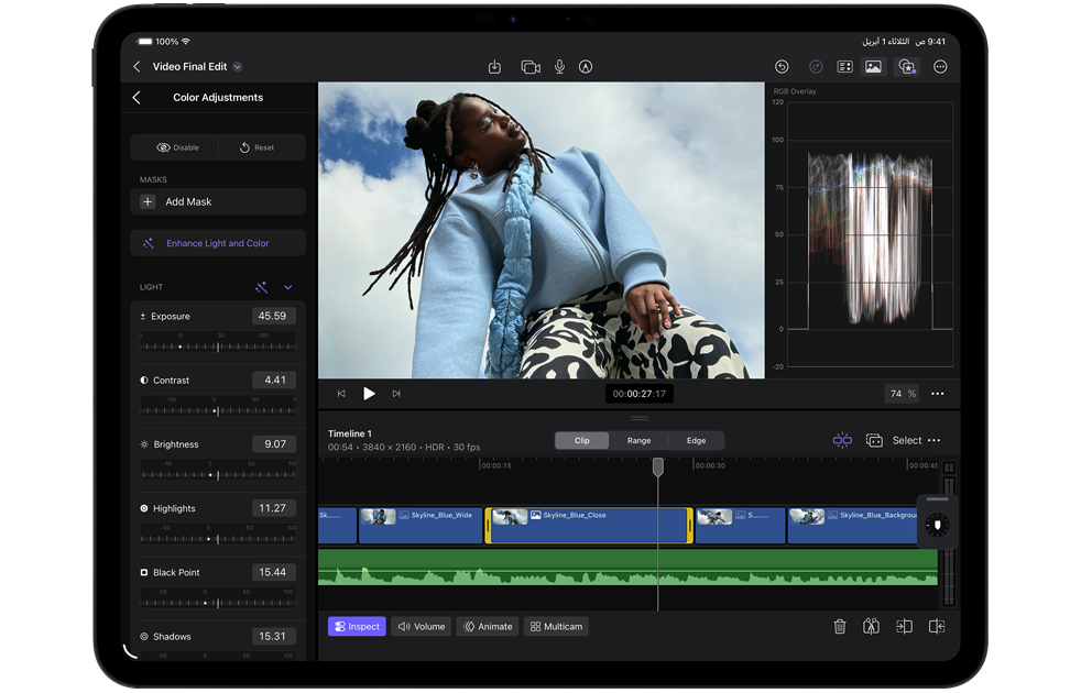 صوّر وعدّل وشارك على جهاز واحد فقط بفضل نظام كاميرات Pro‏ وماسح ضوئي بتكنولوجيا لايدار وميكروفونات بجودة الاستوديوهات الاحترافية وأربعة مكبرات صوت. التقط فيديوهات ProRes بوضوح 4K وسجّل حلقة بودكاست واختَر الميكروفون المناسب لكل تطبيق باستخدام منتقي الإدخال.