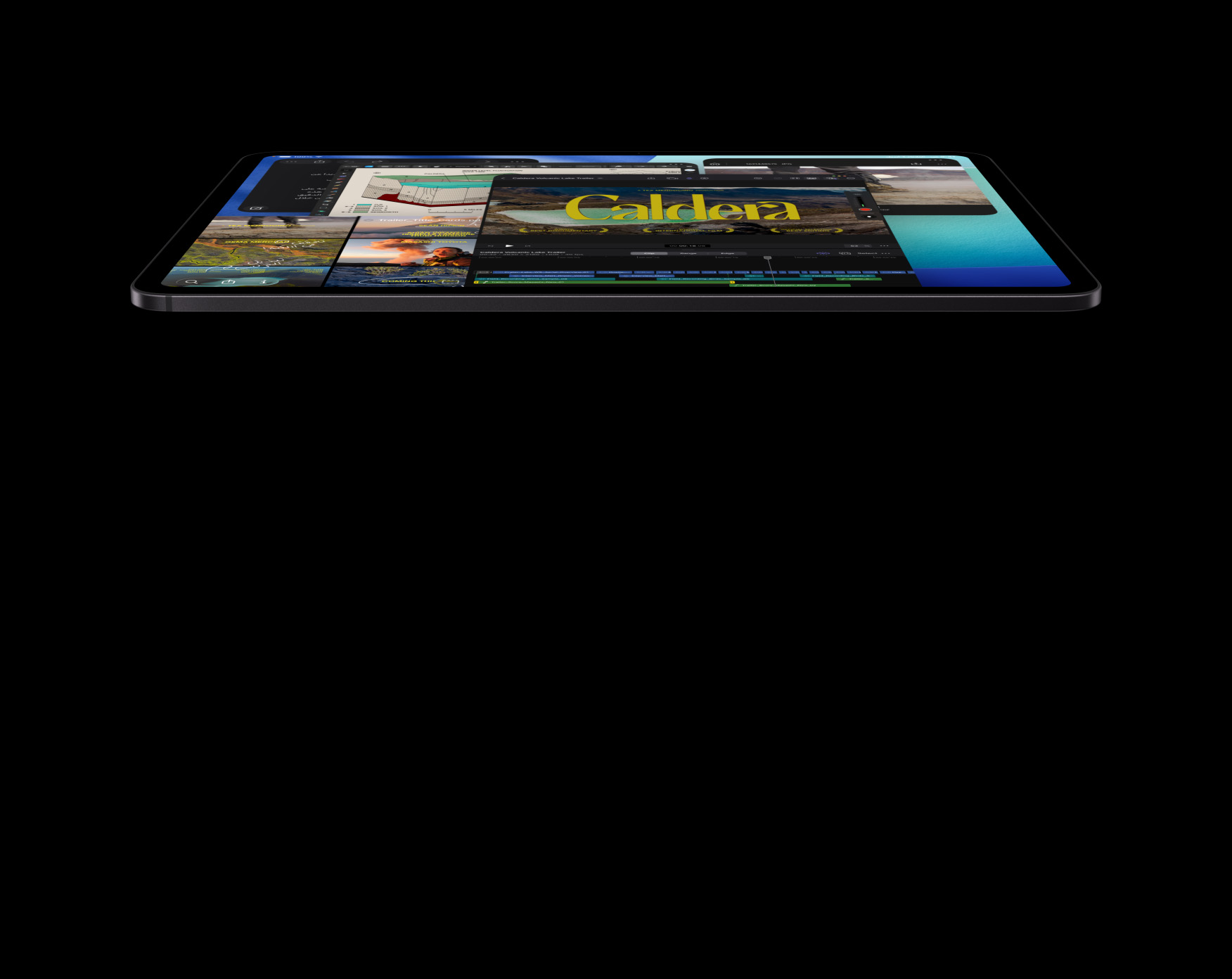 جهاز iPad Pro، الجزء الأمامي الخارجي، الوضع الأفقي، لون أسود فلكي، متصل بلوحة مفاتيح ماجيك، لون أسود فلكي، الشاشة تعرض نوافذ تطبيقات متعددة تشمل تطبيق Final Cut Pro مع ميزات تعديل فيديو متعددة وشريط زمني، وتطبيقَي الخرائط والملاحظات، ومقاطع وسائط متنوعة
