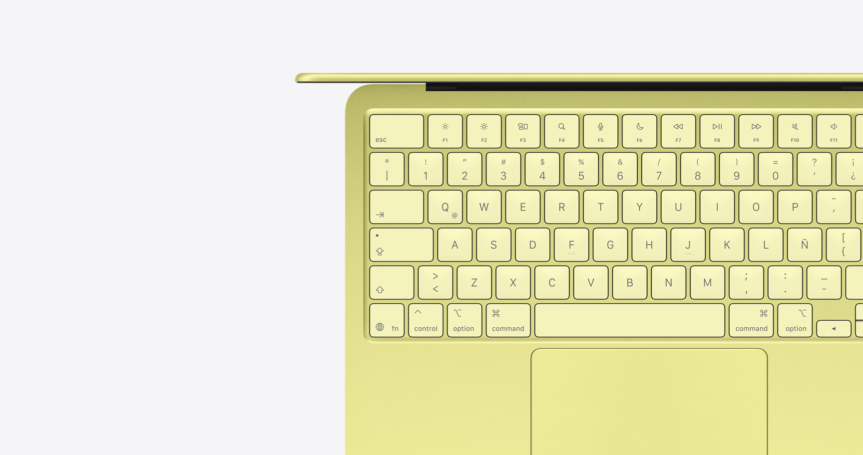 Una mano sostiene en la punta de los dedos una MacBook Neo en color amarillo cítrico, la pantalla muestra un patrón abstracto y colorido
