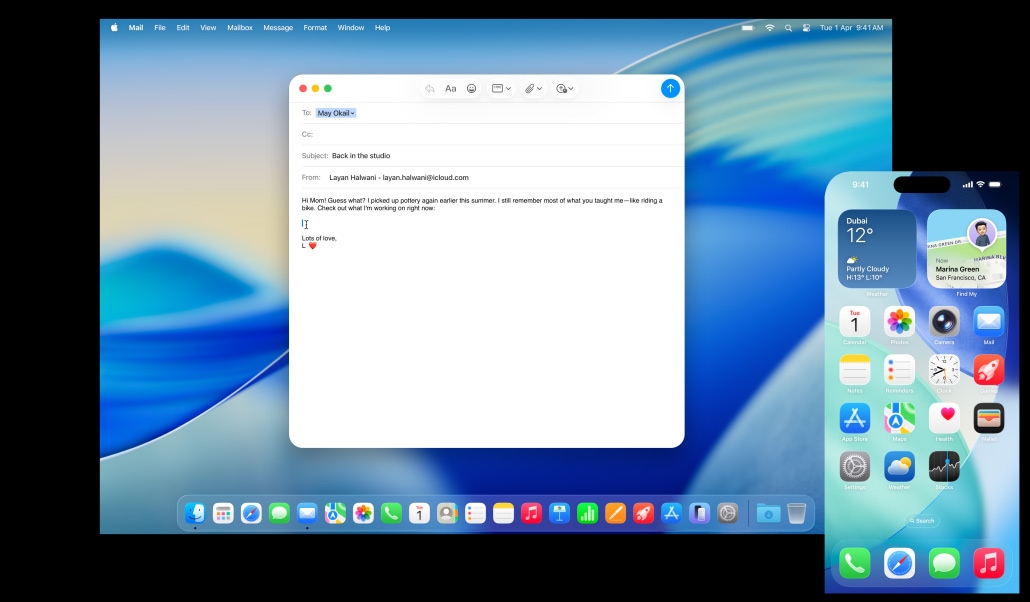 iPhone Mirroring lets you see and use your iPhone right from your Mac.5 So even if your phone is getting charged across the room, you can still access all your favorite iPhone apps. Live Activities from your iPhone also appear on your Mac. So when timely events occur, you don’t have to reach for your phone to stay in the know. You can even drag and drop a video from your Mac to your iPhone, so you can continue editing on the go.