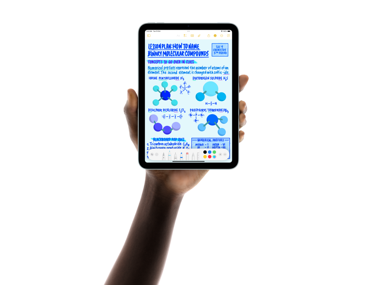 Five iPad mini models are shown in a fan formation held by a user’s hands. One model shows the back camera, the other four are front facing. Apple Pencil Pro is being used to take notes.